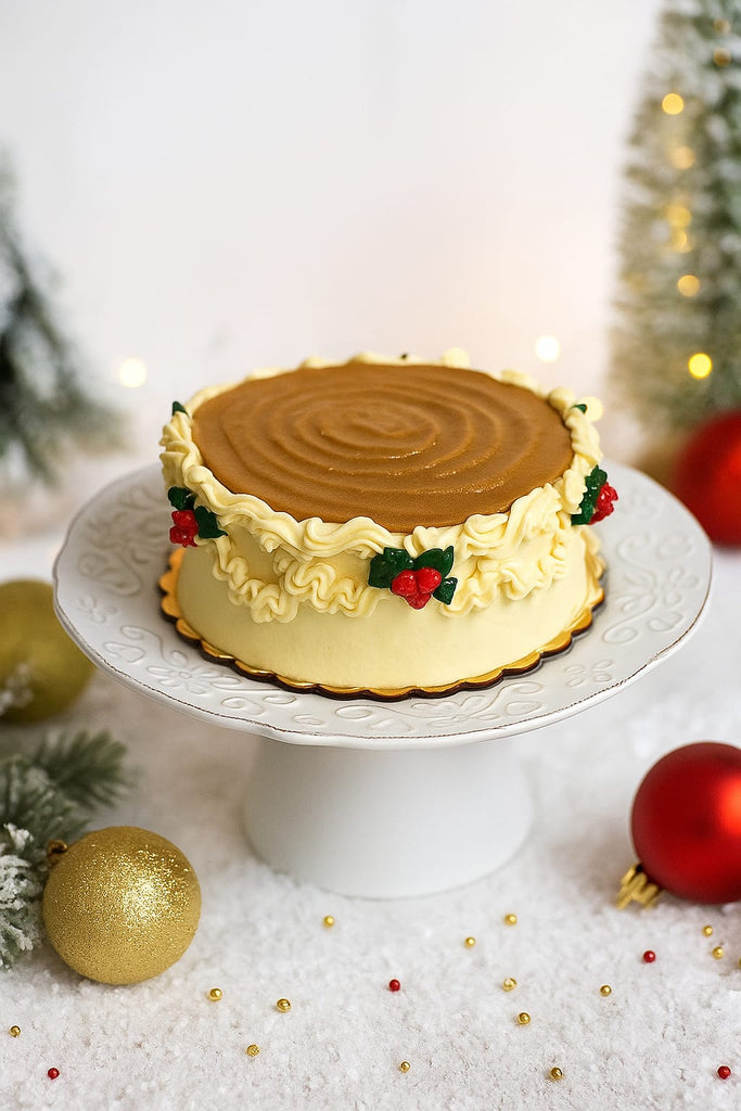 Queque de vainilla con semillas, relleno de caramelo y crema de caramelo.